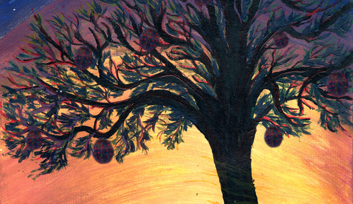 This is an illustration for a book cover with the concept of a mysterious tree in the sun set. The requested main color is dark purple and bright orange. I made this with acrylic color.